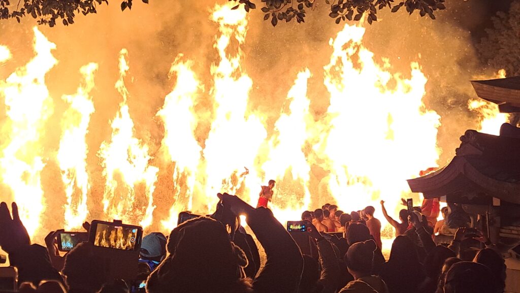 Japanissa uusi vuosi on rauhoittumisen aikaa (ei ilotulituksia yms.), mutta pari viikkoa vuoden vaihteen jälkeen kotimme lähellä olevalla temppelillä järjestetään vuosittainen ”himatsuri” eli tulifestivaali. Yli 800 vuotta vanhan perinteen mukaisesti nuoret vähäpukeiset miehet juokset valtavien tulien vierestä ja siten toivotaan terveyttä ja suojaa taudeilta.